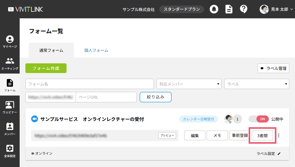 VIVIT LINK(ビビットリンク)で3者間の日程調整を始めるには、フォーム一覧画面から「3者間」と表示されているボタンを選択します。