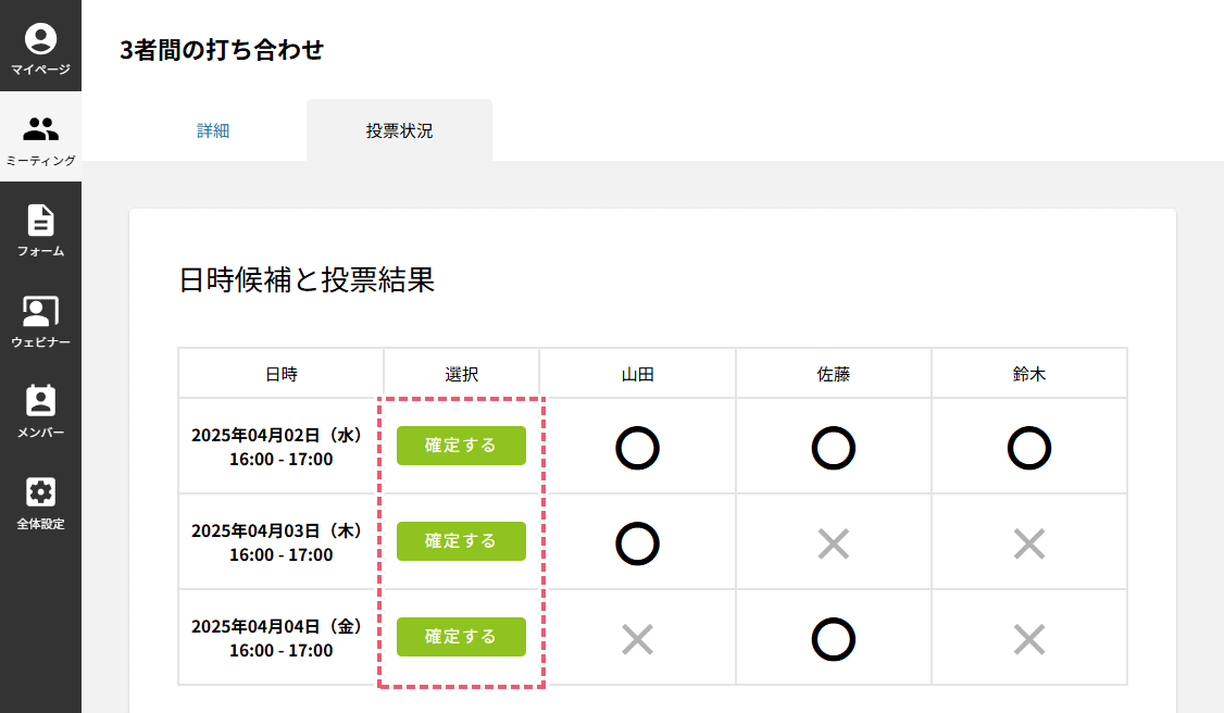 全員の回答が揃ったら、メールで通知が届きます。メール内に記載されたURL、もしくはマイページから投票結果を確認し、「確定する」ボタンをクリックすると、日程調整が完了します。