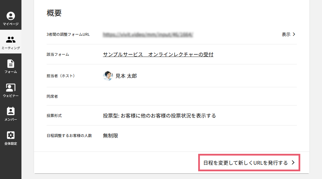 万が一、候補日時では都合が合わない場合は、「概要」ページの「日程を変更して新しくURLを発行する」から、別の候補日を設定可能です。