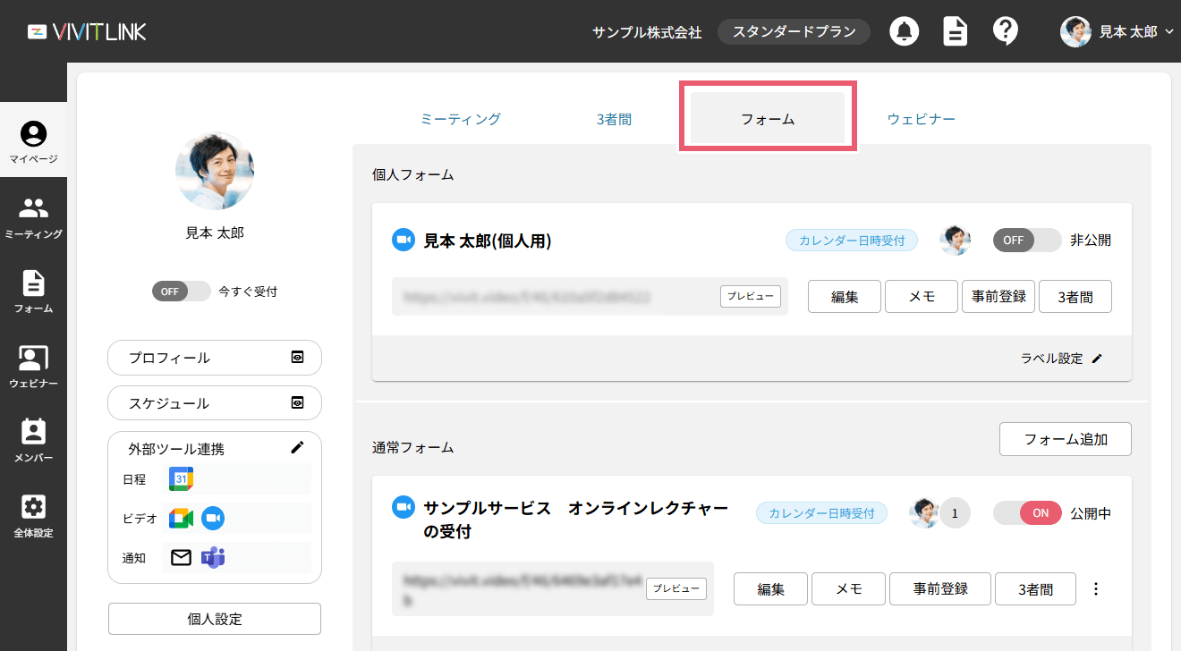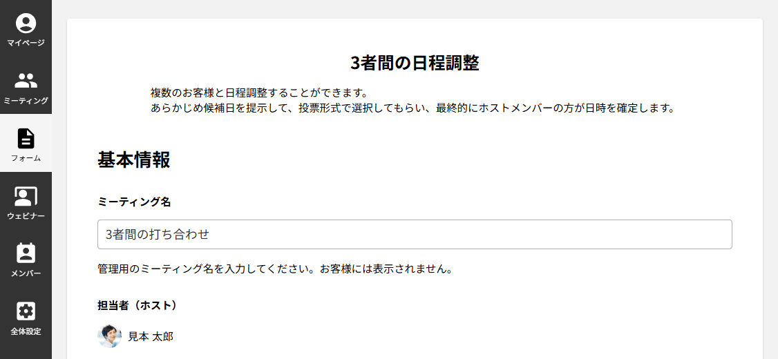 すると、会議名や参加者の情報など、必要項目を入力できる画面に移動します。なお、マイページの「フォーム」メニューからも、同じ設定画面へ移動可能です。
