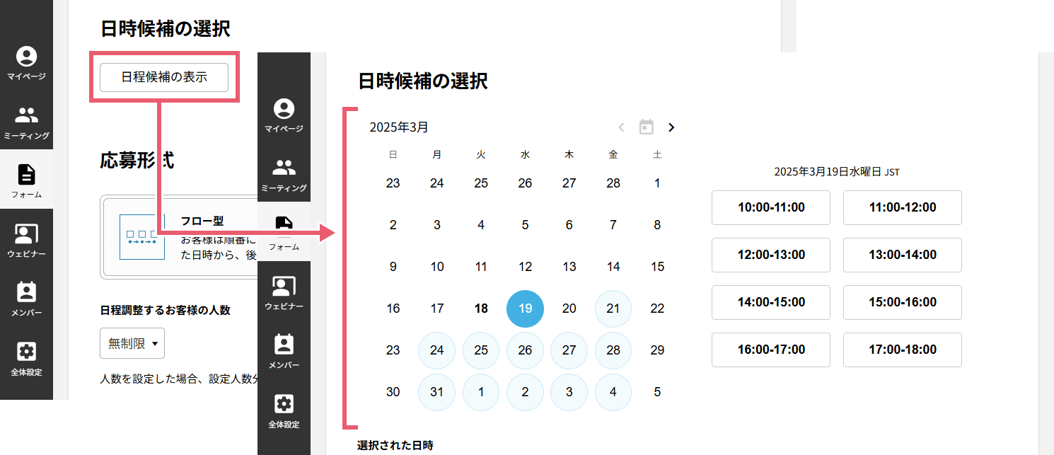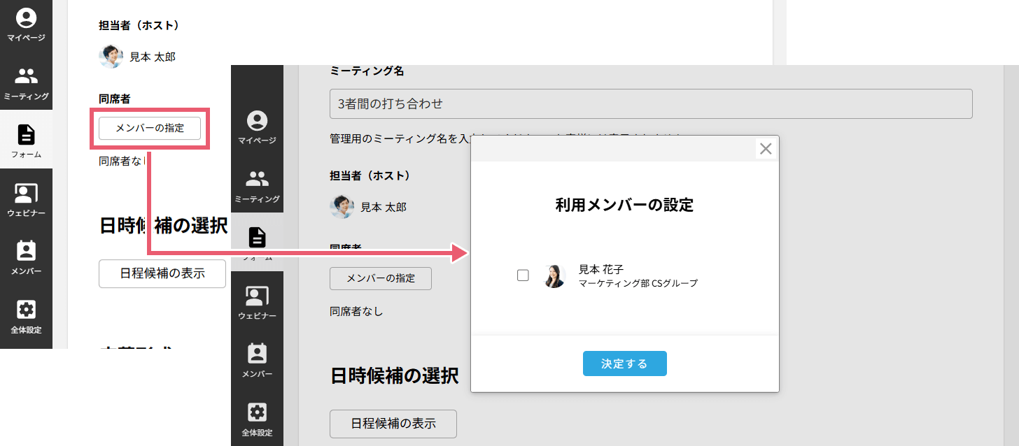 同席者がいる場合は「メンバーの指定」から選択します。メンバーの一覧が表示されるので、参加予定の担当者にチェックを入れていきましょう。その後、「日程候補の表示」をクリックしてカレンダーを開き、候補となる日時を選んでいきます。
