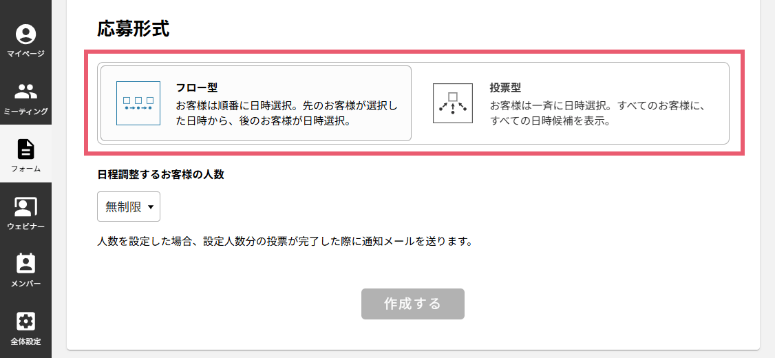 最後に投票形式と参加人数を設定します。投票形式には2種類あり、全員に同じ候補日を表示する「投票型」と、全員が参加できない日時を他の人に表示しない「フロー型」から選べます。投票型は素早く日程を決められ、フロー型は営業パートナーと提案する場合などに適しています。
