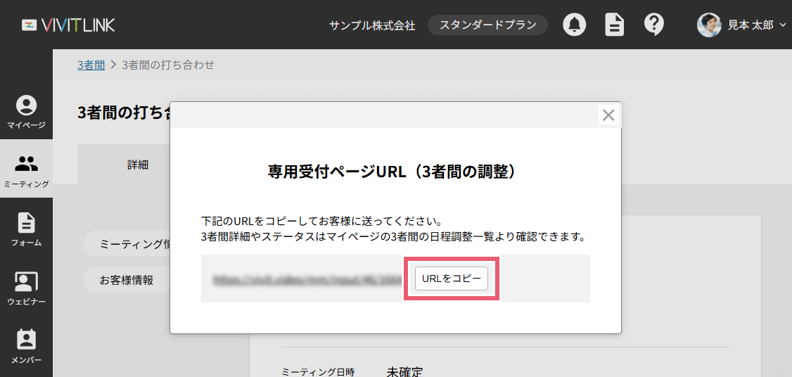 フォームの設定が完了すると、専用のURLが画面に表示されます。日程調整をしたい相手にURLをメールやチャットで送信することで、相手は候補日時を確認できるようになります。
