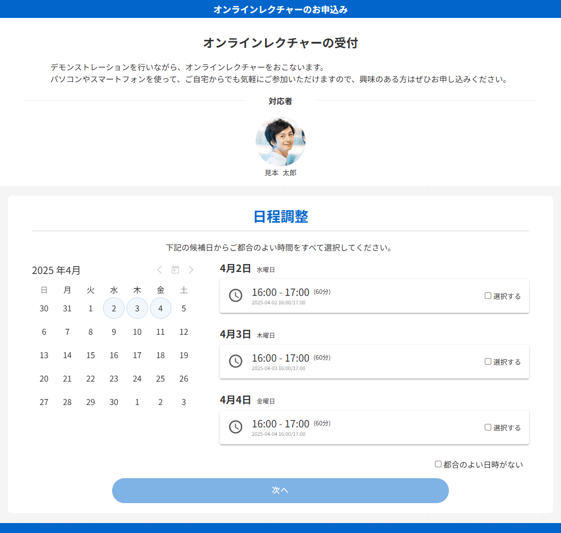 URLを受け取ったゲストは、表示された画面から希望する日時を簡単に選ぶことができます。画面に表示された候補日時から都合の良い時間を選択するだけで回答が完了します。