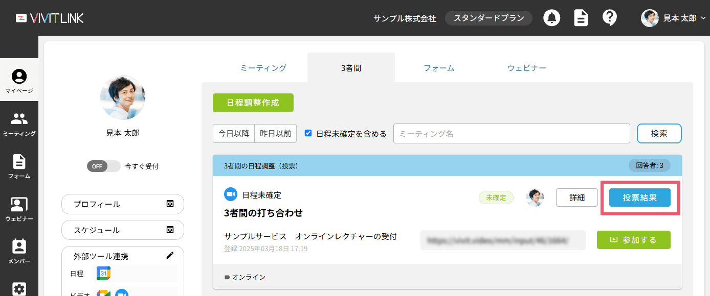 3者間日程調整フォームを作成したあとは、マイページのミーティング一覧画面に「3者間」のタブが表示されます。表示された「3者間」タブを選択すると、作成した日程調整フォームの一覧が表示されます。